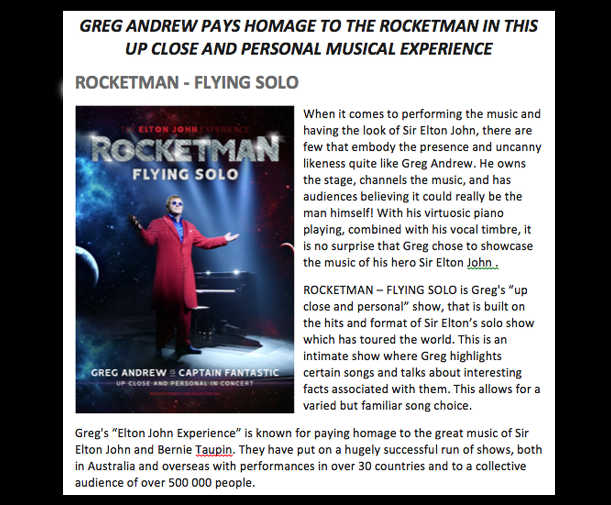 ROCKETMAN FLYING SOLO will feature hits from Elton’s back